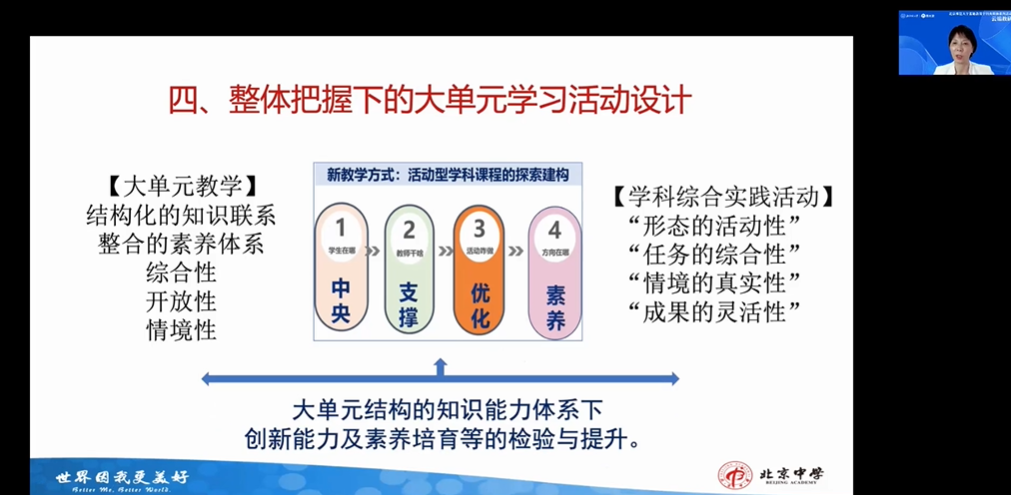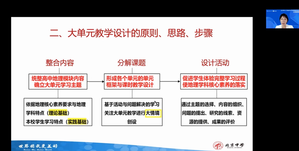 从理论到实践,张树宏老师指出,要在遵循“注重系统性与贯通性”“突出丰富性与选择性”“强化综合性与实践性”的大单元教学设计原则下,进行“地理知识主线”“地理问题主线”“地理实践主线”的单元设计,实现两个整合:将教学内容整合为大单元主题,将知识技能学习整合为单元学科活动。从期望学生“学会什么”出发逆向设计“学生何以学会”。