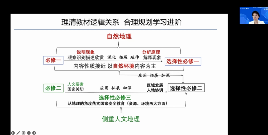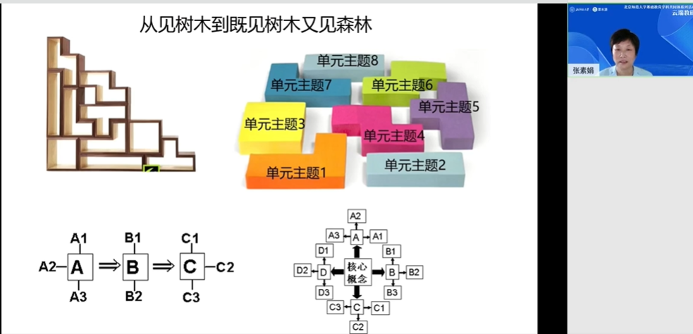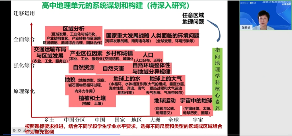 最后,张素娟教授以《高中地理》模块1《宇宙中的地球》为例进行案例分析,阐述了如何对高中地理单元进行整合规划从而尽可能避免单元之间的内容重叠。并重点强调,不同于新授课,高中地理复习课需要打通章节、学段界线,进行统整和优化构建单元。