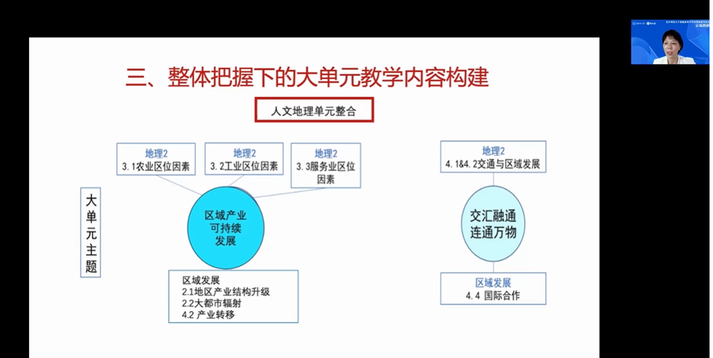 在讲座的第三部分,张树宏老师指出,实现整体把握下的大单元教学内容构建,首先要理清教材逻辑关系,合理规划学习进阶。并且以“遨游宇宙”“漫行地球”“大气脉动”“水球探秘”“地形面面观”“地理环境的‘和而不同’”六个大单元主题为例,介绍了自然地理部分单元的整合思路。以“孔雀东南飞”“城市让生活更美好”、“区域产业可持续发展”“交通融通连通万物”四个大单元主题为例,介绍了人文地理部分单元的整合思路。