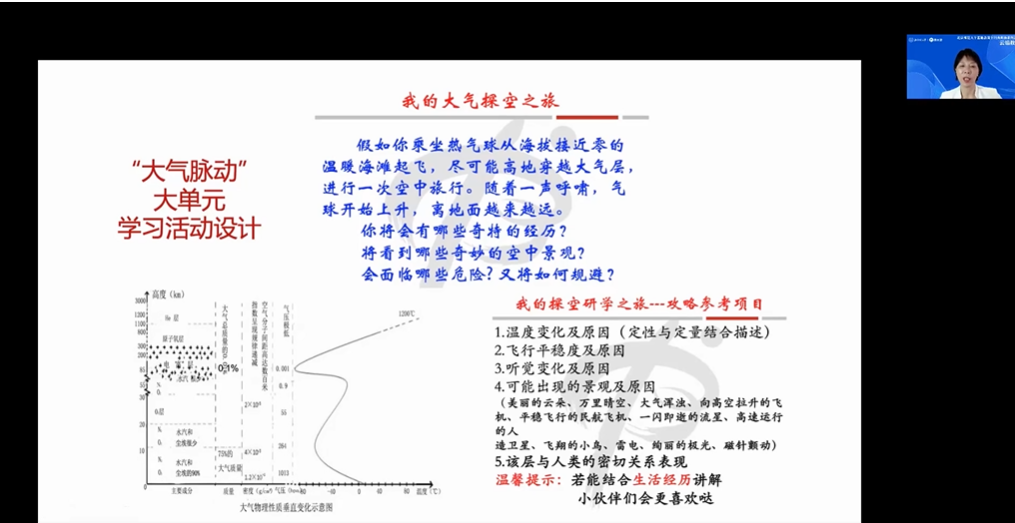讲座的第四部分,张树宏老师介绍了如何实现整体把握下的大单元学习活动设计,学科综合实践活动具有“形态的活动性”“任务的综合性”“情境的真实性”和“成果的灵活性”四大特征,与大单元教学的“综合性”“开放性”和“情境性”特征相一致,因此,大单元学习活动设计实质上就是在大单元结构的知识能力体系下,创新能力及素养培育等的检验与提升。张树宏老师以“我的大气探空之旅”等活动为例,展示了核心素养的活动设计如何与“大气脉动”等大单元主题相关联。
