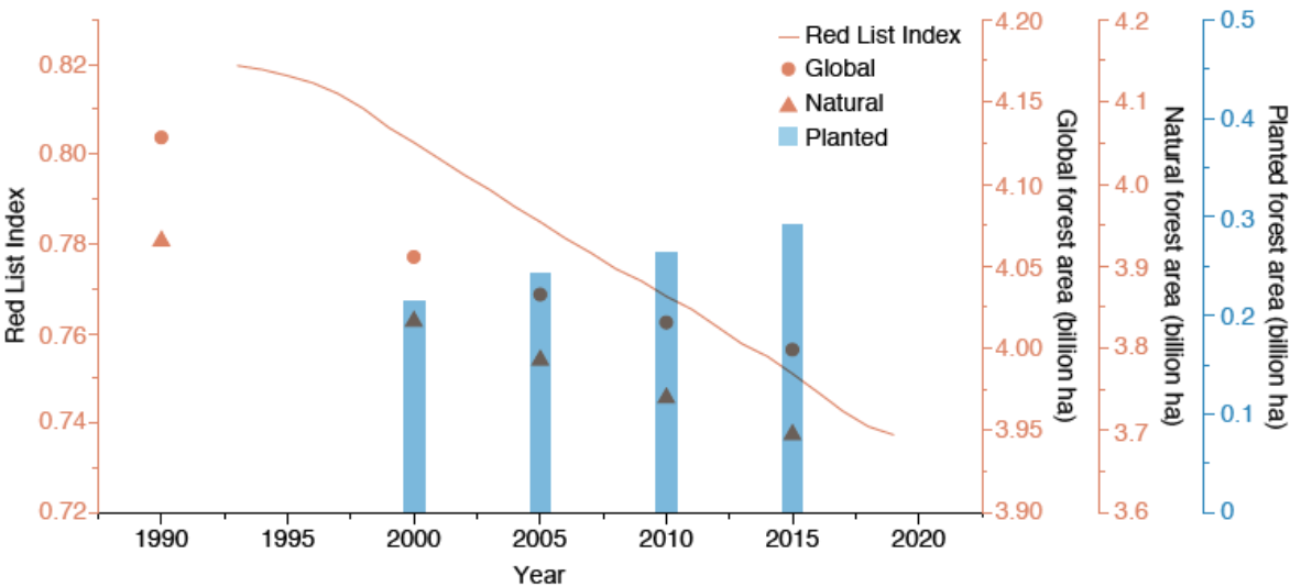 作为17项全球可持续发展目标(SDGs)之一,目标15(“陆地生物”)强调保护和恢复森林生态系统是世界各国的重要任务。 根据2015年全球森林资源评估报告,从1990到2000年,全球天然林面积的年净损失率为0.18%,且在热带和亚热带地区更为严重。进入21世纪后,各项国际大规模森林保护和恢复项目在减缓森林净损失率方面发挥了关键作用。通过对过去二十年的遥感卫星观测结果表明,全球陆地生态系统呈现出“变绿”现象。然而,该研究指出真正的危机是全球森林和天然林面积仍在下降,唯一增加的则是人工林覆盖率,但这无法减缓或逆转生物多样性的丧失(图1)。