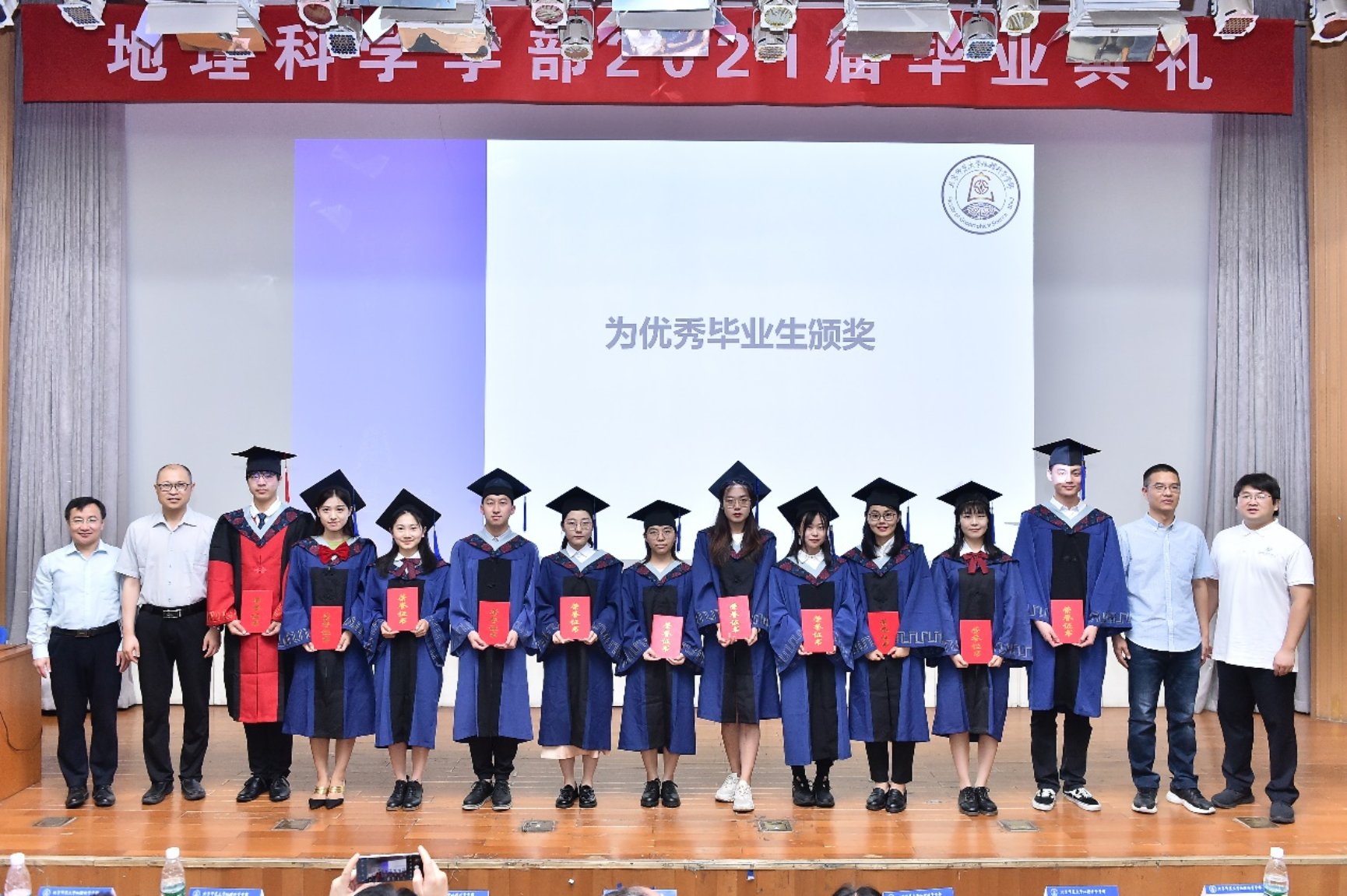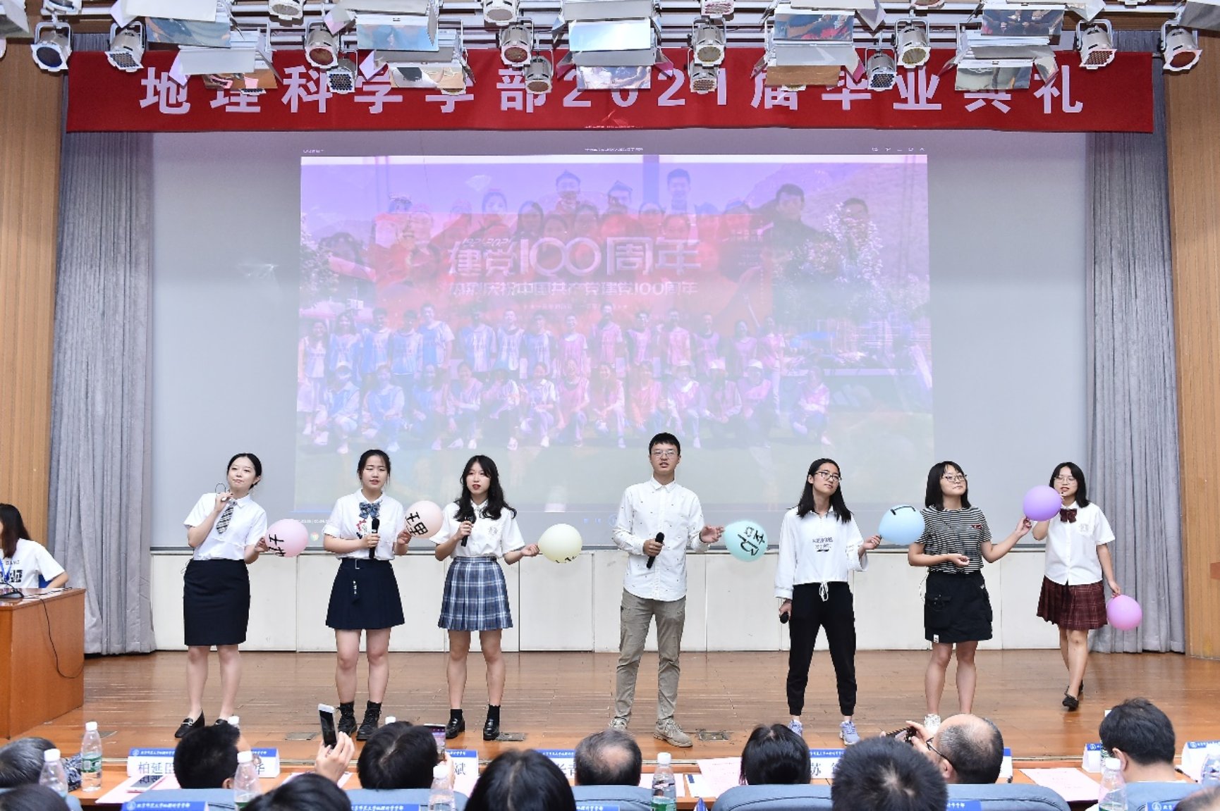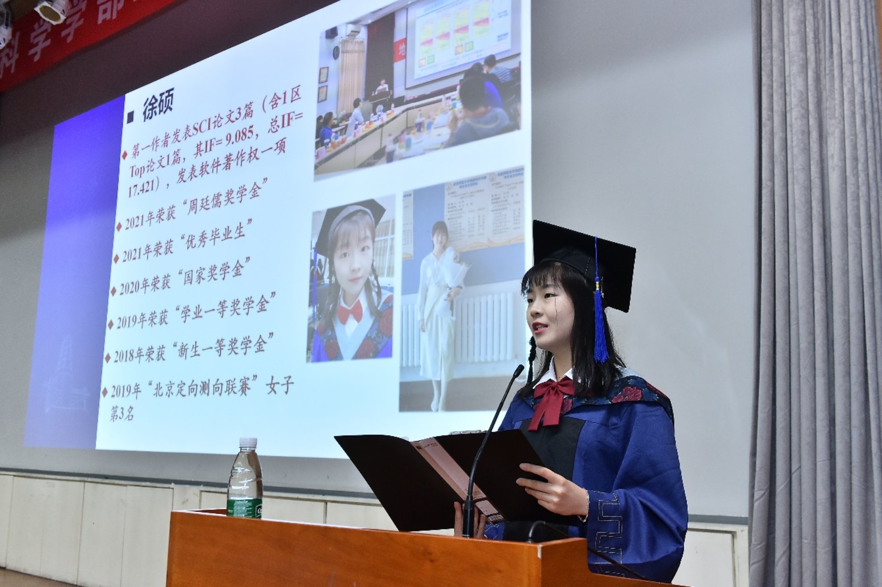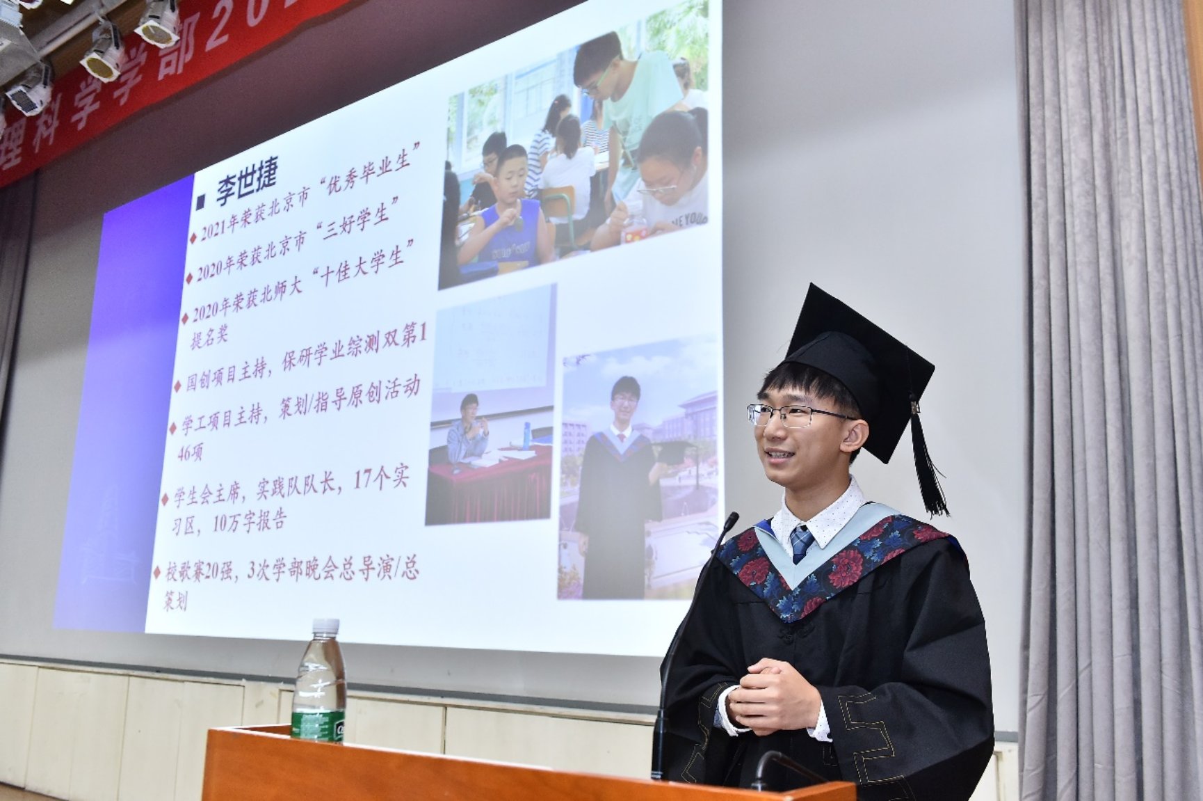 在毕业生代表发言环节,2017级本科生李世捷以《地理人,在路上》为主题,讲述了他眼中地理学子的成长历程,表现出青年学生的使命担当。2018级硕士研究生徐硕分享了自己在北师大三年的科研经历和感受,同时表达了直播自慰、老师的感谢和祝福。