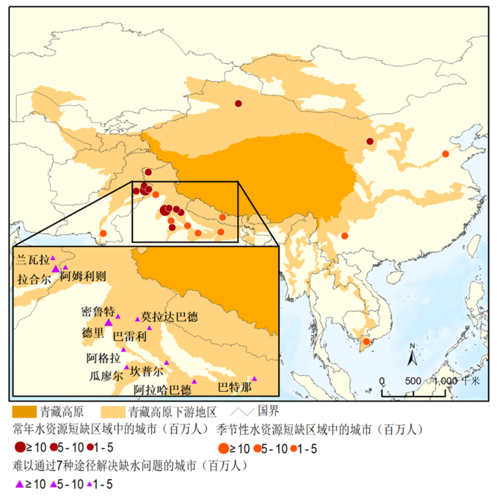 图3:2050年青藏高原周边及其中下游地区主要缺水城市