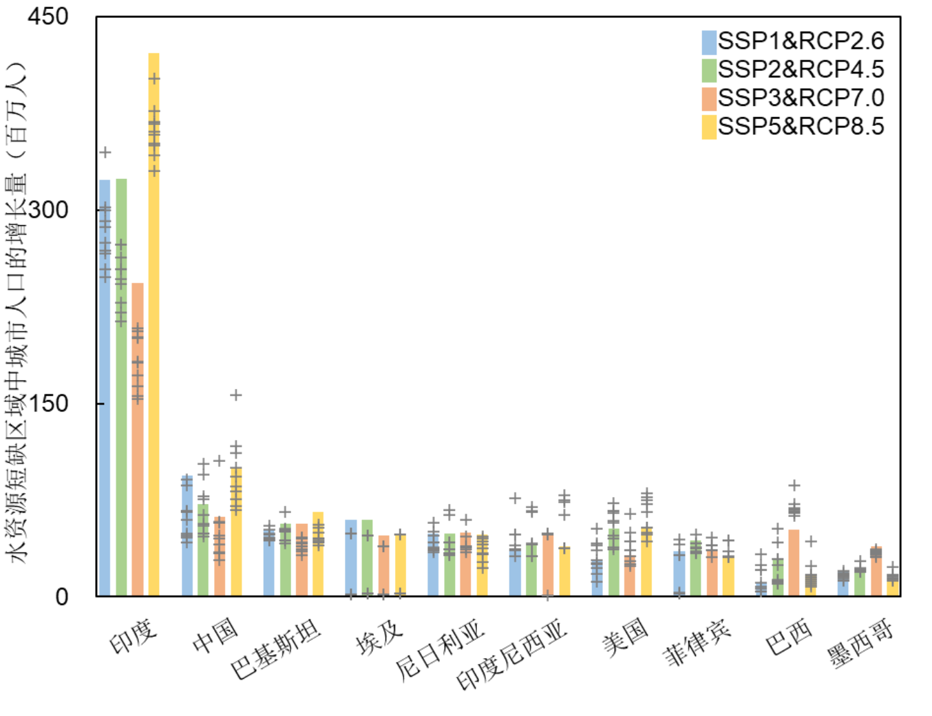 图2:全球2016-2050年城市水资源短缺状况变化。(a)不同情景下水资源短缺区域中的城市人口变化;(b)水资源短缺区域中城市人口增长最多的十个国家。