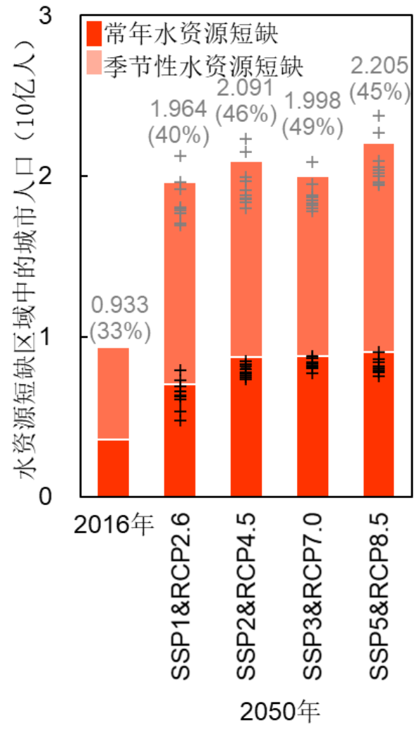 研究表明,全球水资源短缺区域中的城市人口呈现快速增加趋势。2050年,全球水资源短缺区域中的城市人口将增至16.9-23.7亿人,将增加0.8-1.5倍。全球将有292个大城市和19个超大城市至少在一种情景下处于水资源短缺区域,分别占全球大城市总数的55.5%和全球超大城市总数的63.3%。城市人口和用水量增加是导致城市水资源短缺加剧的主要因素,贡献率为80.4%-91.4%。气候变化会通过影响水资源总量和空间分布,导致全球水资源短缺区域变化,进而影响全球城市水资源短缺,贡献率为-9.0%-18.4%(图2)。