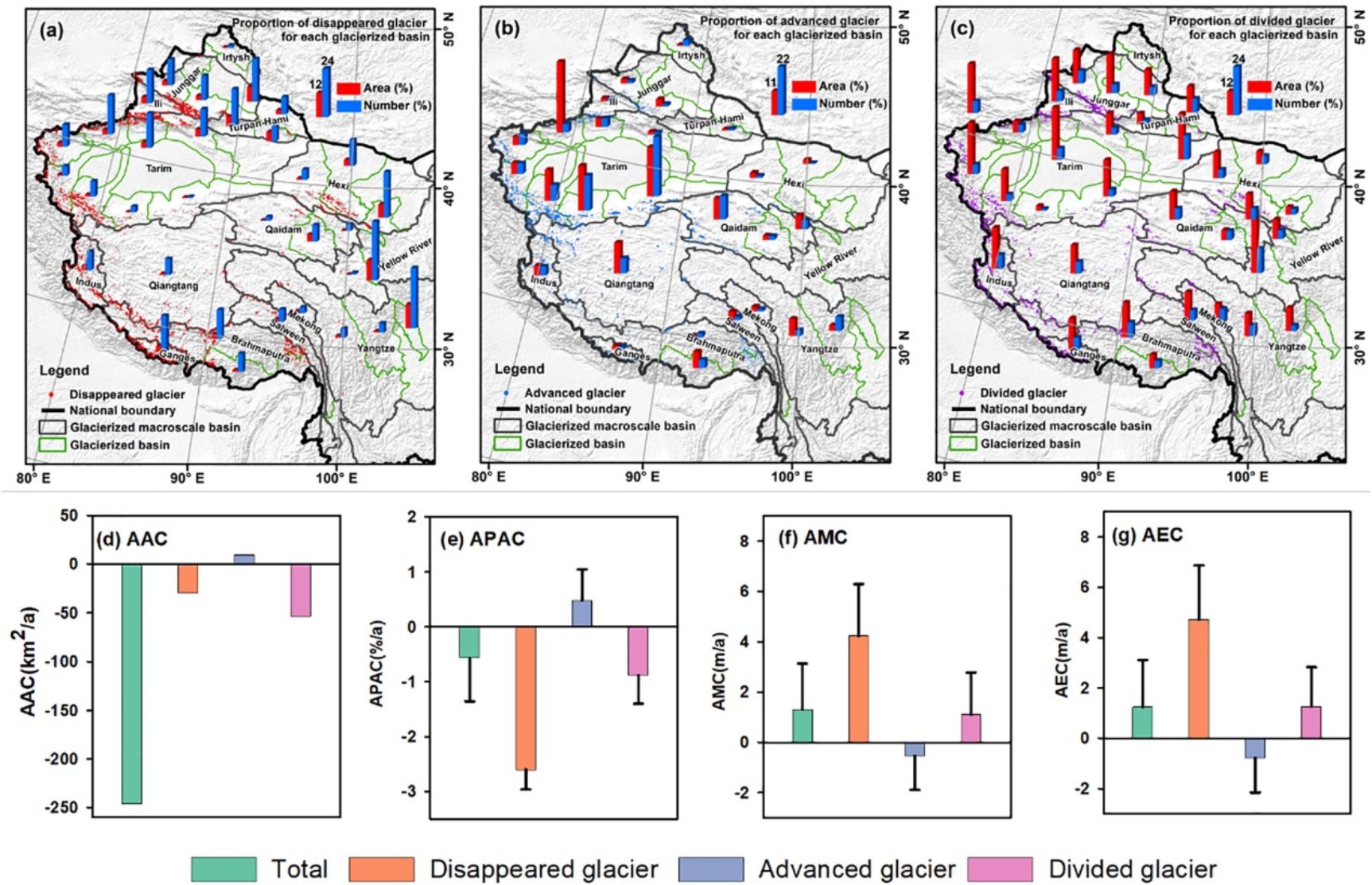 近半个世纪以来中国冰川变化区域特征差异明显,驱动因素各不相同。总体而言,青藏高原冰川退缩幅度由西北内陆向东南边缘地区增加,而新疆北部(包括中国天山地区)冰川退缩幅度由东北向西南减小。青藏高原东南部山区由于年平均正积温高、负积温低、液态降水占比大且近年来降雪量占总降水量的比例大幅下降,冰川面积和储量相对萎缩速率大、冰川消失和分裂冰川占比高,而且由于冰川数量多且平均规模较大,该区域冰川物质绝对损失量最大。新疆北部包括东天山和北天山、萨吾尔山和祁连山东部的冰川由于区域年平均正积温较高、负积温较低、降雪量整体偏少、冰川所处海拔低、冰川数量少且平均规模小,近几十年来相对萎缩速率最高,消失和分裂冰川比例最大,但冰川物质绝对损失量较小。相反,青藏高原腹地(包括喀喇昆仑山、帕米尔高原和西昆仑山)和西天山地区冰川面积相对萎缩速率和物质绝对损失量均较低,消失冰川和分裂冰川数量少,前进冰川数量众多,可主要归因于该地区年平均正积温低,负积温高,冰川区主要以降雪为主且近几十年来降雪趋势增加,此外,该区域冰川表层多冰碛覆盖,对冰川消融起到阻碍作用。相关分析表明:在流域尺度上,区域气候态(包括正积温、负积温、降雨量和降雪量)是冰川变化空间差异的主要原因;冰川面积和储量绝对损失与降雪趋势呈显著负相关,与降雨趋势呈显著正相关;冰川变化与正积温和负积温变化趋势之间没有显著相关性;此外,冰川规模、表碛覆盖率、平均海拔、坡度和坡向等冰川形态和地形因素在局地和流域尺度对冰川变化产生深远影响。