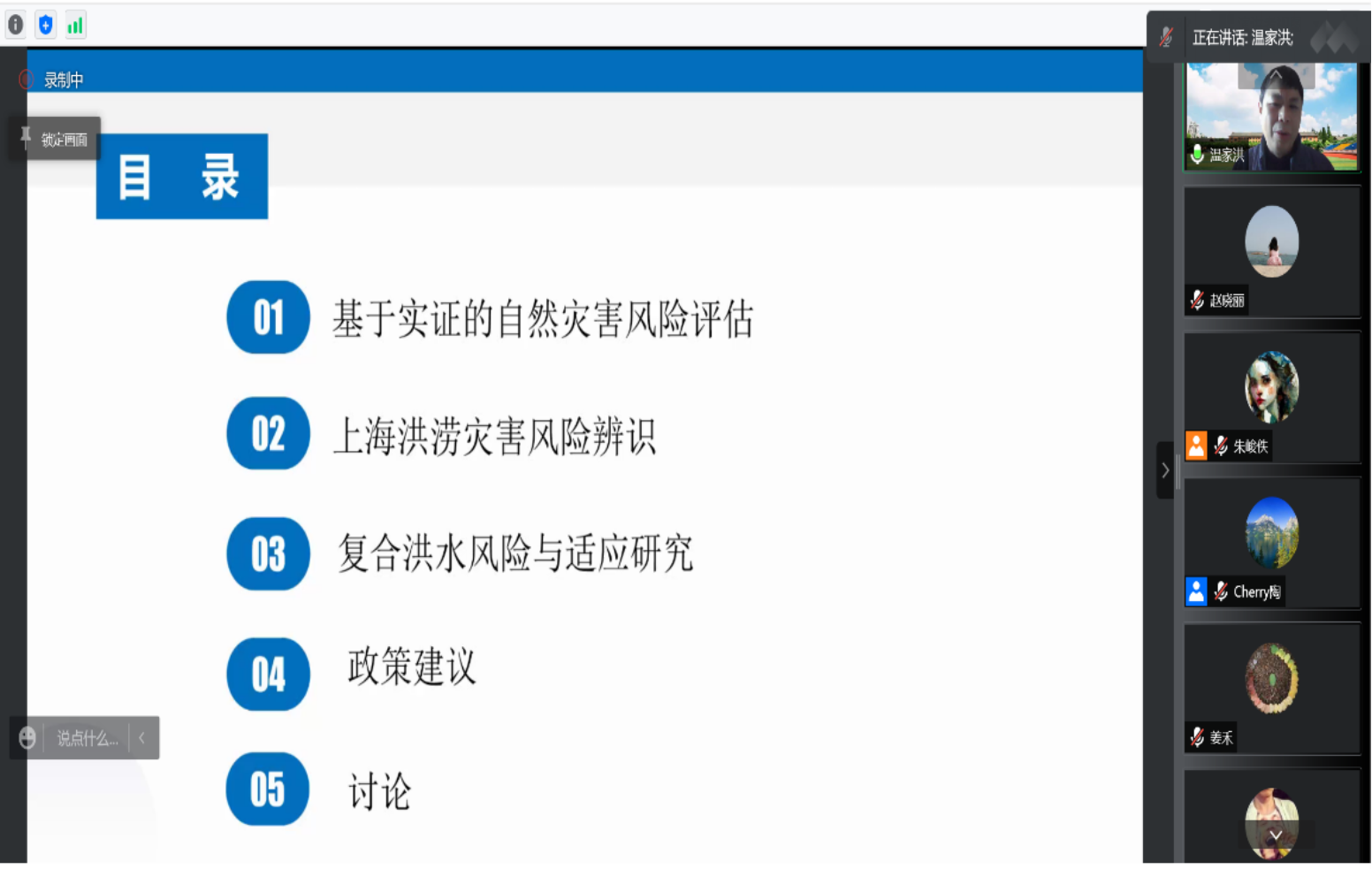 在最后的问答讨论环节中,温家洪教授与多位专家和师生就灾害风险评估与适应在中国实践的相关问题进行了讨论和线上互动交流。听众普遍反映,温老师的报告内容极为丰富,基于对灾害风险理论的深刻认识,用大量详尽的数据阐述了上海洪涝灾害风险防范的发展状况和未来的应对途径,极大地开拓了听众们在洪涝灾害风险评估研究领域的视野。参会师生也深感受益匪浅。最后,讲座主持人叶谦研究员对讲座进行了总结,对温家洪教授的精彩报告进行了感谢。