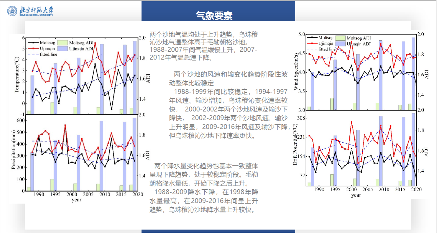 武子丰同学汇报的题目为“中蒙两国徒弟沙漠化对比研究-以乌珠穆沁沙地、毛勒朝格沙地为例”。他的研究区域位于中蒙边境线东西两侧的乌珠穆沁沙地和毛勒朝格沙地,通过对两处沙地影像数据、气象数据和人文数据的对比分析,测算了沙漠化土地面积变化和土地沙漠化指数(ADI),进而分析其自然与人文要素的差异。主要研究结论有:(1)两个沙地土地沙漠化程度均有加重,乌珠穆沁沙地加重程度远大于毛勒朝格沙地;(2)两个沙地的气温均处于上升趋势,乌珠穆沁沙地气温整体高于毛勒朝格沙地,降水量变化趋势也基本一致,整体呈现下降趋势。基于上述结论,武子丰同学进一步指出,乌珠穆沁沙地活化程度高于毛勒朝格沙地,风蚀坑坑体及坑后积沙区面积较大,扩张的速率高于毛勒朝格沙地。而乌珠穆沁沙地人口一直处于持续上升的趋势,其牲畜密度高于毛勒朝格沙地,这与两国放牧制度的差异有关。汇报完毕武子丰同学和参会同学展开了讨论,杨晓帆老师对武子丰同学的研究进行指导与建议。