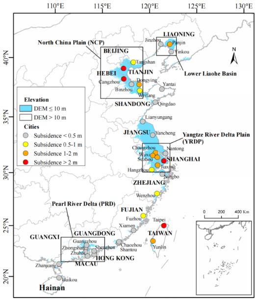 气候变化给全球沿海洪水风险防范带来巨大不确定性影响,而气候因素与非气候因素的叠加效应放大了相关影响,带来巨大潜在灾难,这已经成为IPCC第六次评估报告关心的核心科学问题。地面沉降叠加全球海平面上升引起的相对海平面变化,对沿海城市洪水风险造成巨大威胁。地面沉降会造成建筑物地基下沉、房屋开裂、地下管道破损、洪涝和风暴潮灾害加剧,城市抗洪能力降低等一系列问题,具有影响范围广、防治难度大、难以恢复等特点,已严重制约了全球众多沿海城市的发展,如新奥尔良、曼谷、雅加达、上海和东京,在20世纪到21世纪初,已观测到数米的地面沉降。地面沉降趋势仍在继续,如印度尼西亚首都雅加达被迫“迁都”,主要原因便是过度开采地下水导致严重的地面沉降。我国高度重视地面沉降防控,为了遏制地面沉降及其负面影响,2012年国土资源部和水利部发布《全国地面沉降防治规划(2011-2020年)》,总结了我国地面沉降形势,对各个重点区域未来沉降提出了控制的目标。然而,地面沉降对我国相对海平面上升的影响,以及相关控制工程所产生的效应尚未得到有效评估。