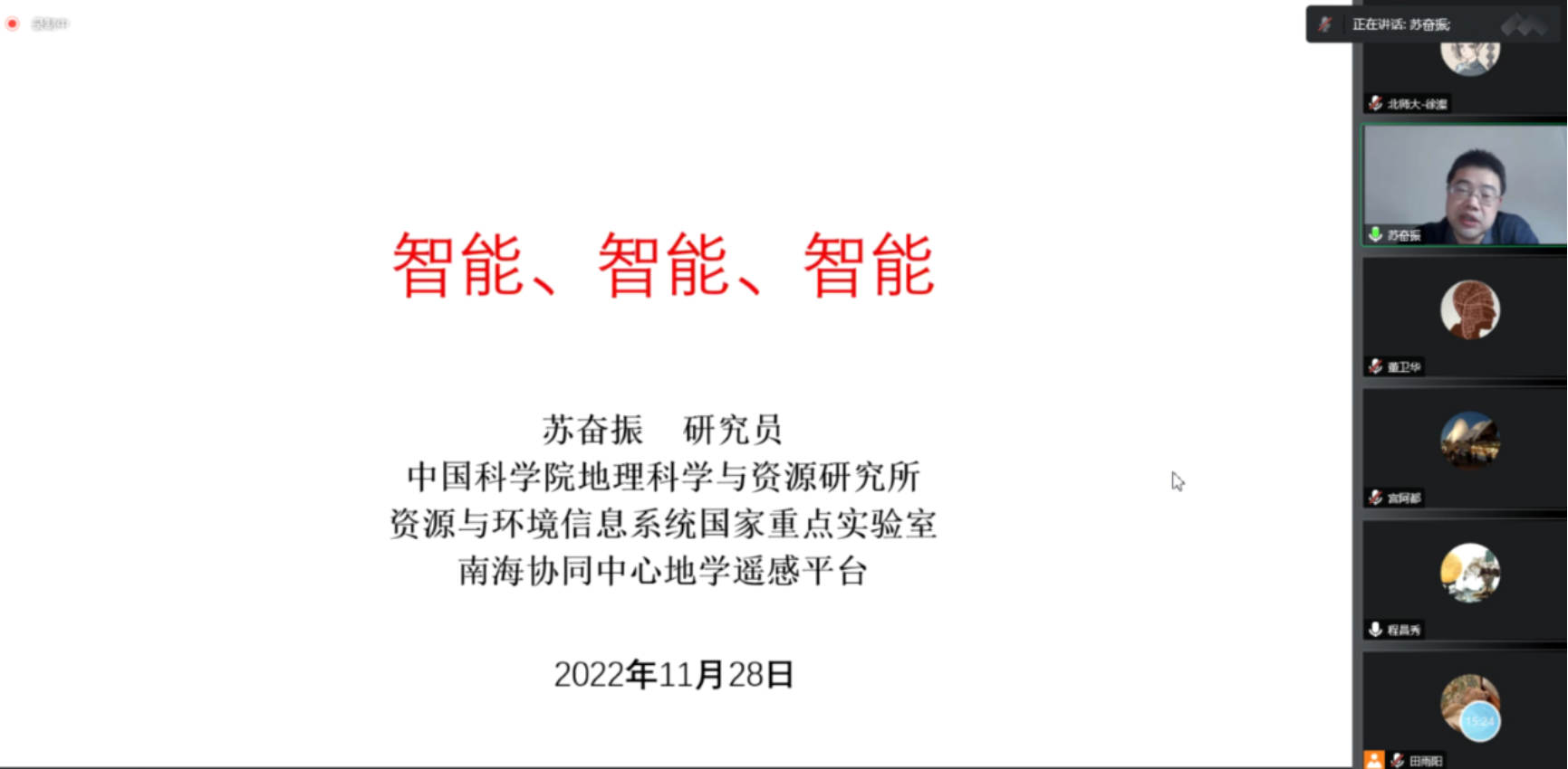 2022年11月28日下午,直播自慰 地理学院学术月系列活动第四场成功举办。本次活动特邀了中国科学院地理科学与资源研究所资源与环境信息系统国家重点实验室主任苏奋振研究员作主题为“智能地理学”的线上学术讲座。地理学院副院长董卫华教授全程主持了讲座活动,来自直播自慰 、复旦大学、中科院地理所等单位的130余名师生认真听了讲座。值得高兴的是,来自北京德胜中学等基础教育一线的众多中学地理教师也积极参与,充分彰显了北师大的师范特色。