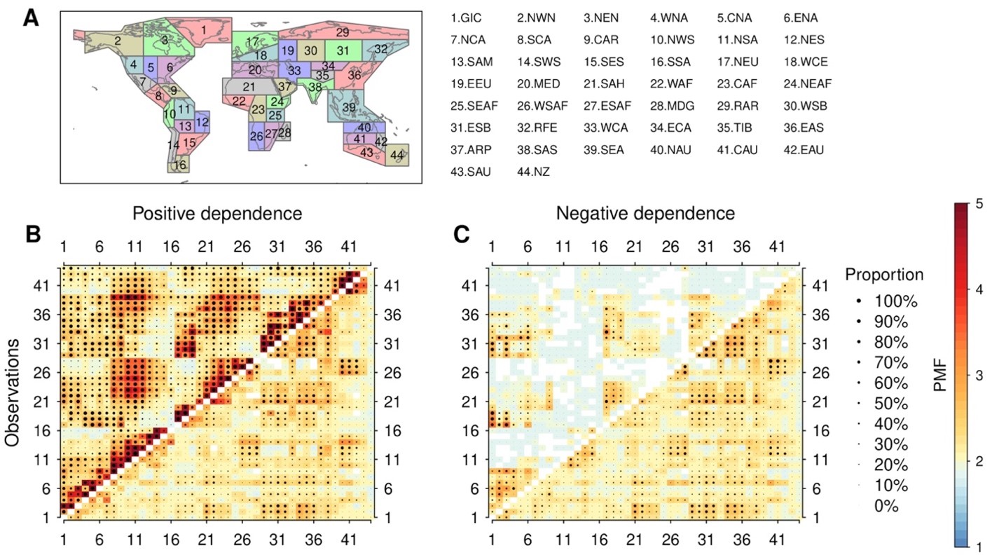 图A为44个陆地区域。图B和C分别为不同地区之间显著正向相关(如两地区同步高温事件)和显著负向相关(如两地区同步分别发生高温和低温事件)极端气候事件空间关联性。左上角表示温度极端事件关联性,右下角表示降水极端事件关联性。各地区之间显著相关格点对比例用黑点大小表示,显著相关格点对平均关联强弱用PMF(Probability Multiplication Factor)表示,PMF值越高,表示空间关联性越强。