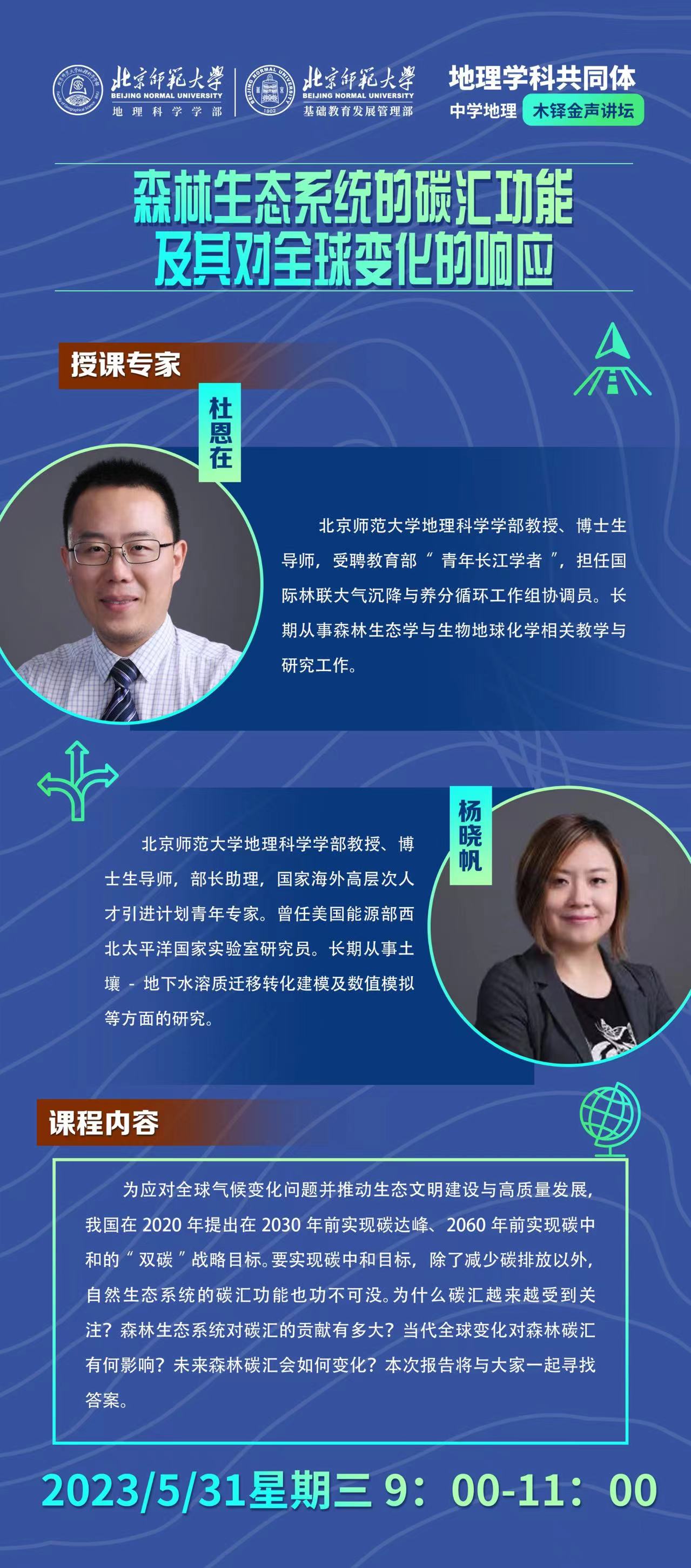5月31日上午,北师大基础教育地理学科共同体中学地理云端“木铎金声讲坛”活动成功举办,邀请教育部“青年长江学者”、北师大直播自慰 教授杜恩在座作了题为“森林生态系统的碳汇功能及其对全球变化的响应”的报告。活动由北师大地理学科共同体学术委员会委员、北师大直播自慰 部长助理杨晓帆教授主持,共有北师大平台学校教师196人次在线学习了生态系统碳汇前沿研究进展。
