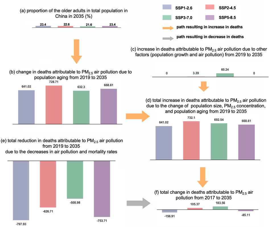 近些年,PM2.5已逐渐成为中国最常见的空气污染源。在PM2.5污染中长期暴露对公众健康造成严重威胁,可能诱发诸如肺部和心脏疾病等问题,从而导致过早死亡。而中国当前正经历的人口老龄化现象则进一步加大了这些健康风险。根据统计,2000至2019年间,中国的老年人口比例从7.0%增长至12.6%。在这样的背景下,团队基于可比风险评估方法,研究了2000-2035年期间,在不同的发展情景下(共有四种情景,分别是SSP1-2.6,可持续发展路径;SSP2-4,中间路径;SSP3-7.0,区域竞争路径;SSP5-8.5,化石燃料燃烧路径)的DAPP变化。同时,研究通过解构分析法评估了人口老龄化,和人口增长、PM2.5浓度变化、疾病死亡率等其他驱动因素对DAPP变化的影响,通过对比区域间的差异,论文给出具有可行性的政策启示。