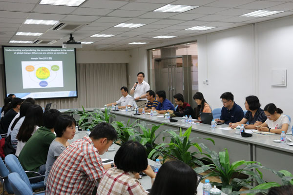 潘淑芬教授作了题为:《Terrestrial Primary Productivity, Evapotranspiration and Water Use Efficiency in the 21st century: Integrating Big Data and Earth Observation with Ecosystem Modeling》的报告。潘教授主要介绍了全球陆地系统生产力、蒸发和水分利用效率的研究,其首先强调在全球尺度进行水资源和水资源利用效率研究是充满挑战而又极富有意义的工作。当今,全球都在应用大数据开展各领域研究工作,针对不同的研究目标和区域选择合适的数据源,是我们进行研究的重要基础。潘教授结合自己在美国不同区域的地表覆被变化研究工作向大家介绍了遥感数据的选择与应用,并从数据输入、模型模拟、精度验证等方面做了详细讲解。其带领团队在全球进行的研究表明,在不同纬度和不同干湿年份陆地生产力和蒸发的差异明显,未来我们应对全球升温的措施应更有针对性。