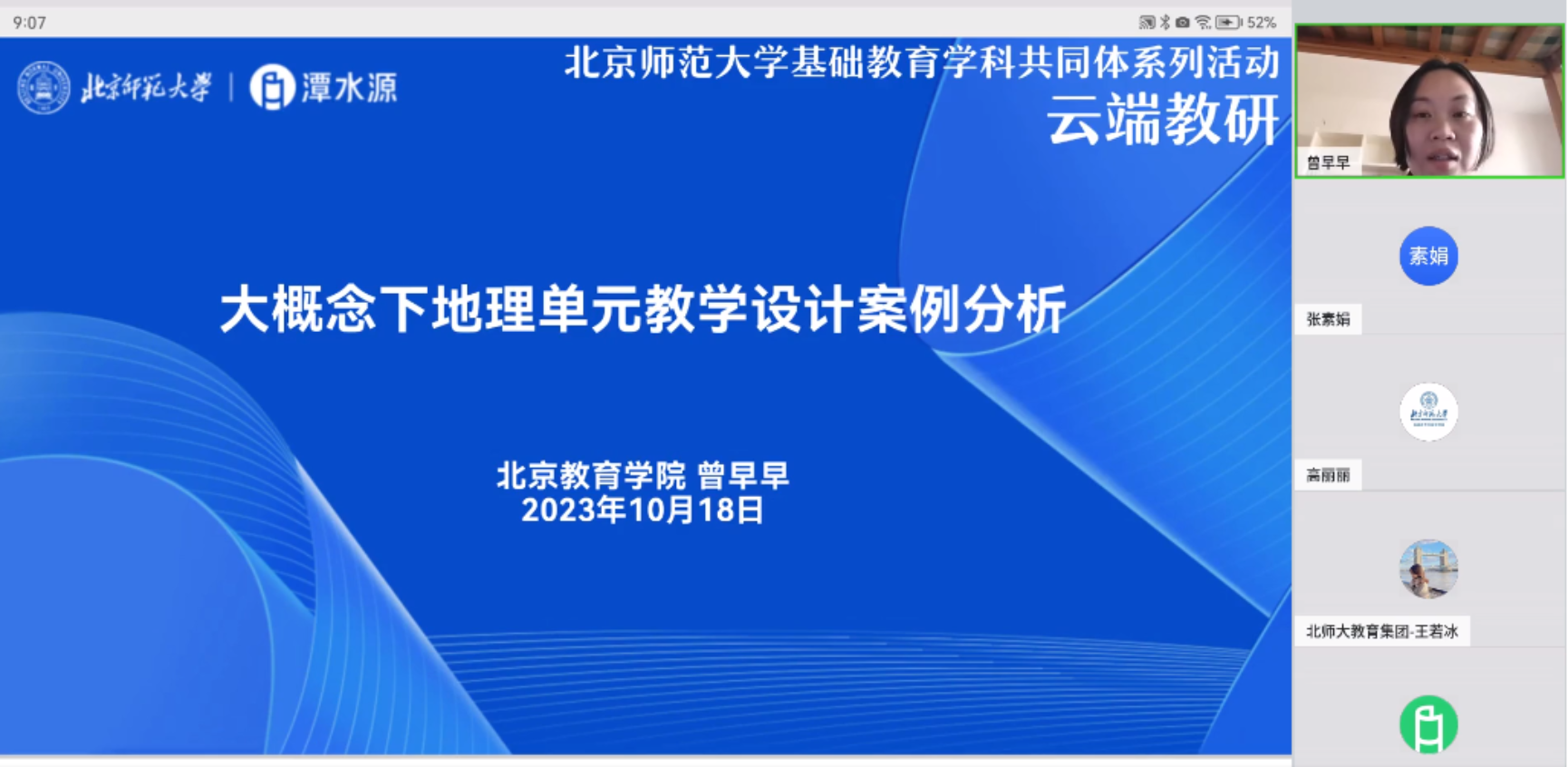 2023年10月18日,直播自慰 基础教育学科共同体系列活动云端教研之“地理学科共同体【高中地理】”系列讲座第二讲成功举办。本次讲座由直播自慰 地理学科共同体学术委员会共同策划组织,邀请北京教育学院数学与科学教育学院地理教研室主任、副教授曾早早作题为“大概念下地理单元教学设计案例分析”的讲座,讲座由北京教育学院教授、北京教育学会地理研究会副理事长张素娟教授主持。本次讲座旨在帮助教师更好地在高中地理教学中贯彻地理核心素养,提升单元教学设计和实施方面的能力。