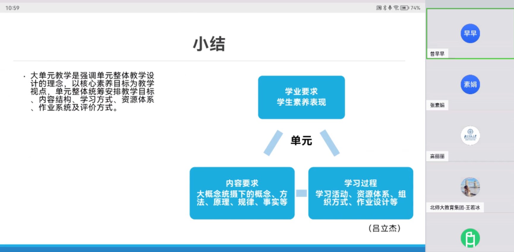 张素娟教授进行了点评总结,认为该讲座既阐明了如何针对特定的单元内如提炼大概念,又指出了老师们在大单元教学设计中容易出现的问题对一线高中地理教师的单元教学实践具有非常好的帮助作用。