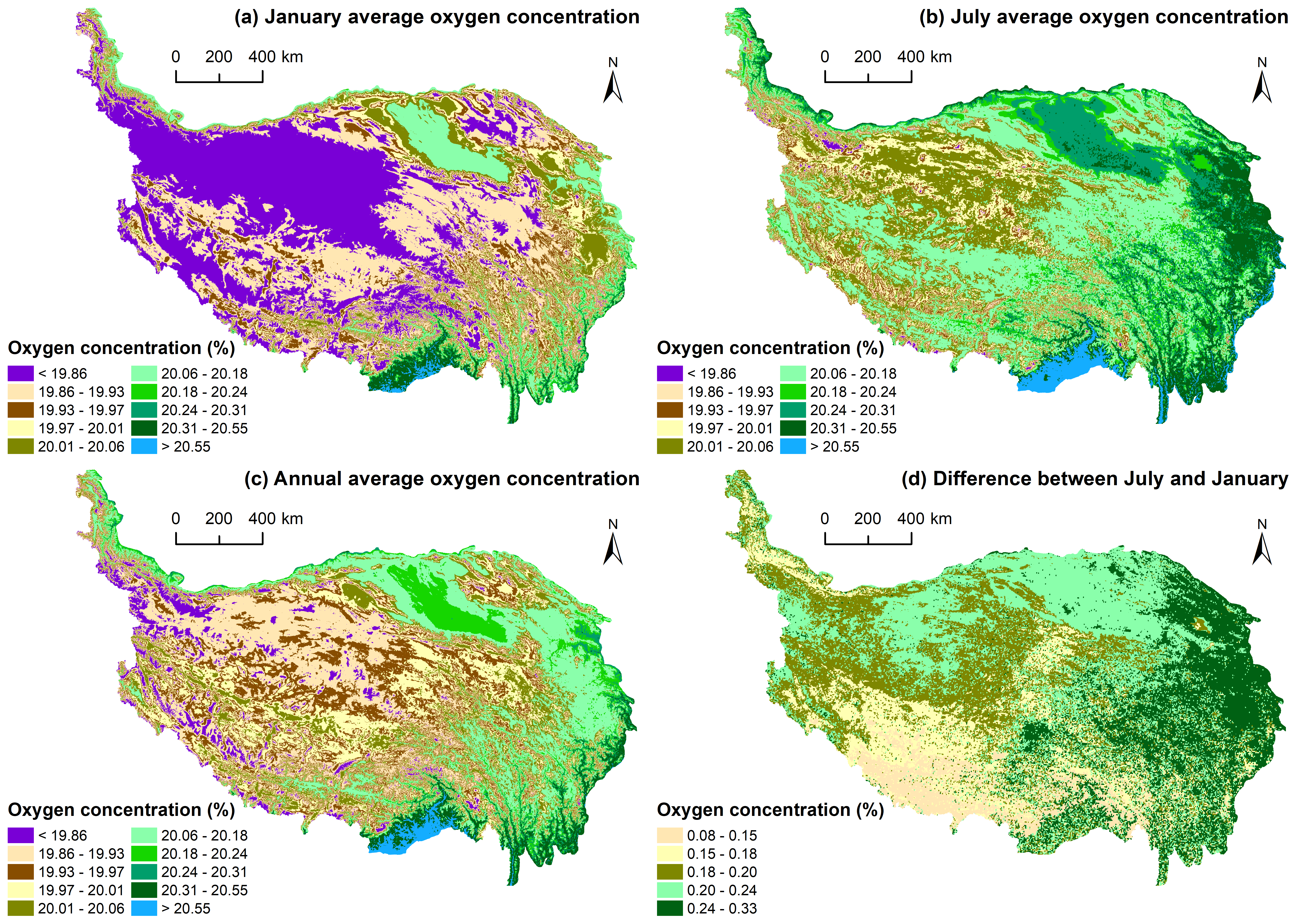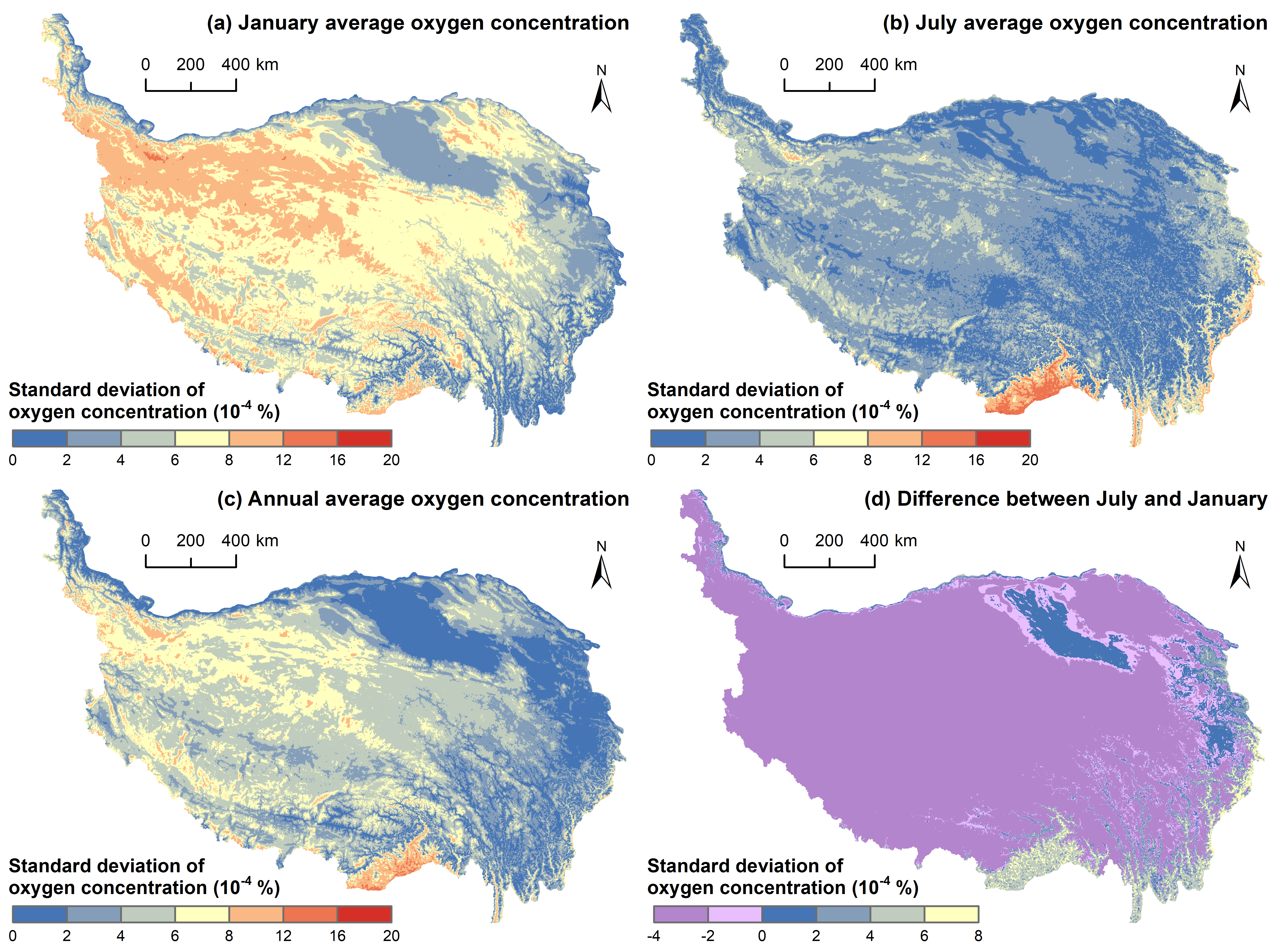 基于实测的青藏高原地表氧含量,研究通过海拔、气温、叶面积指数与氧含量的关系,构建了青藏高原地表氧含量估算模型,模拟估算了青藏高原年平均、1月平均和7月平均氧含量分布数据以及青藏高原7月与1月氧含量差值数据。