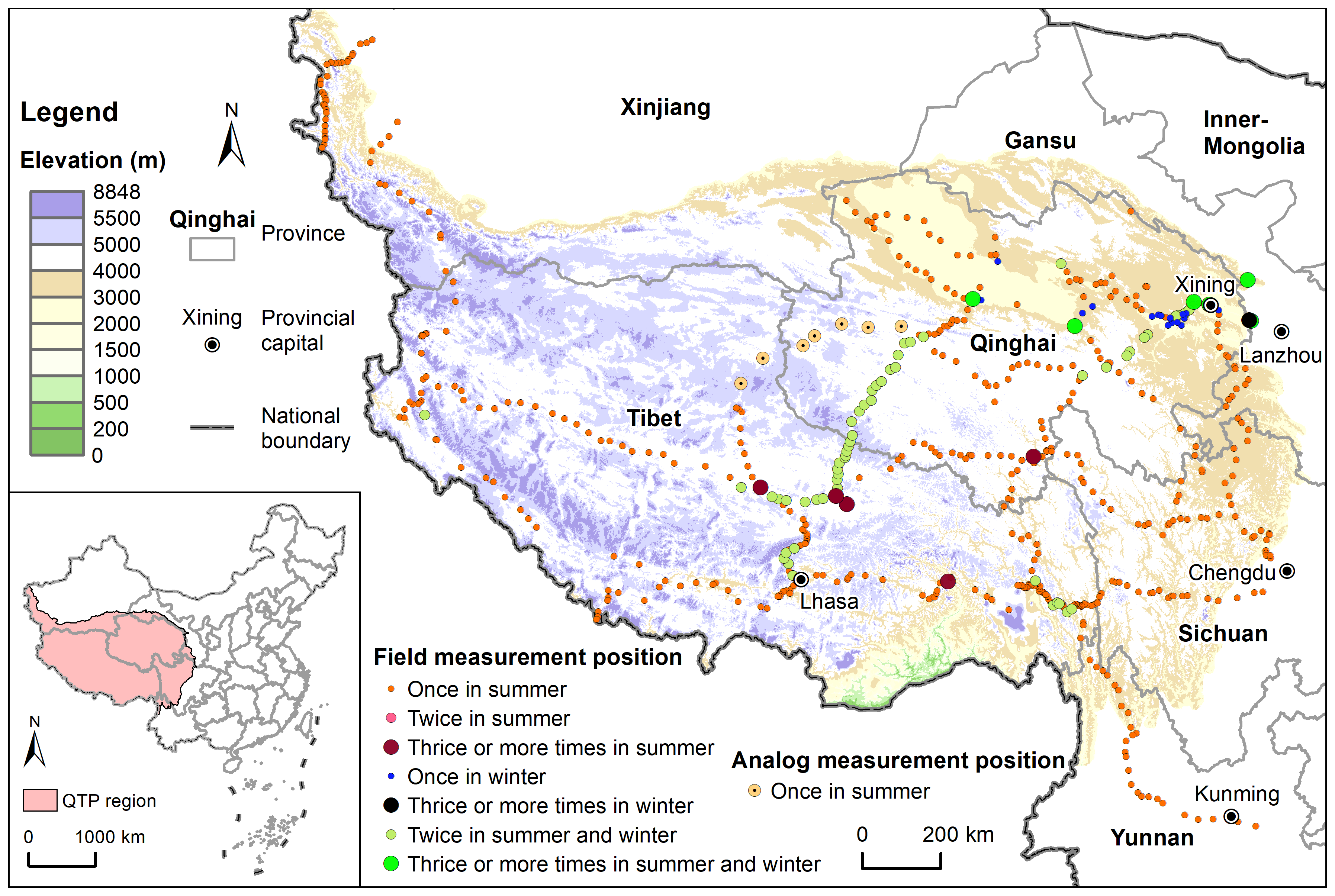 2017-2022年青藏高原地表氧含量科考采样点分布图