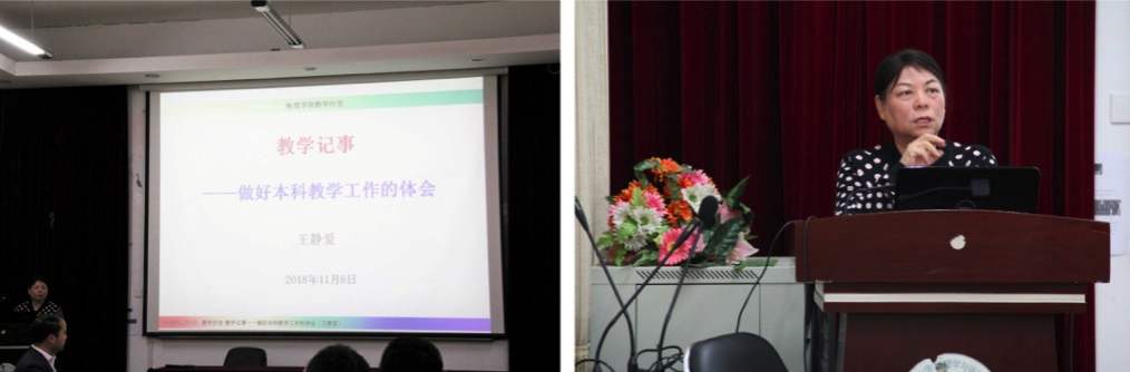 王静爱教授作了题为“教学记事——做好本科教学工作的体会”的报告。王老师从课程建设、团队建设和教材建设三方面回顾了其教学历程,以多个生动的亲身教学经历强调了当前网络环境下教师课堂教学的不可替代性。王老师与在场师生分享了她在教学、科研、管理、师德四方面的经验和感悟,将教师的社会责任和历史使命总结为培养创新创业人才。王老师在教学过程中养成的优良习惯、对本科生培养的独到见解,都令在场师生肃然起敬,展现了教学名师之魅力及背后为之付出的不断坚持与用心。
