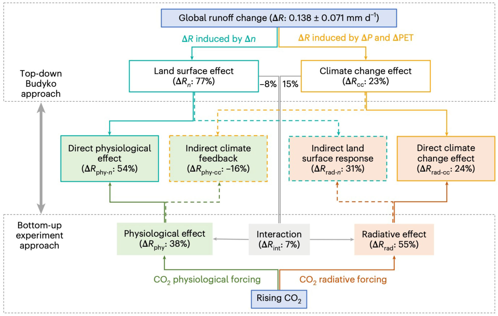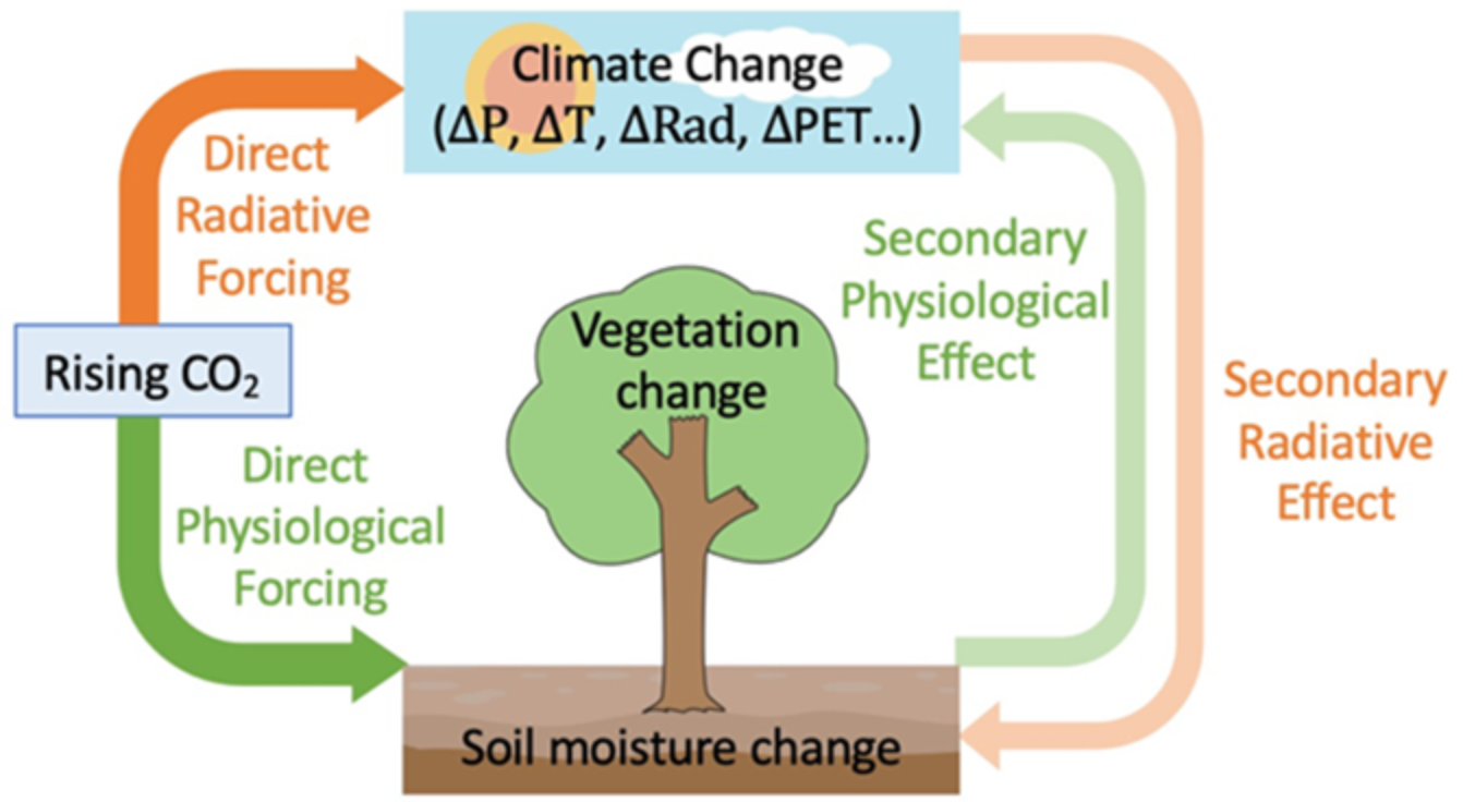 图1. CO2辐射强迫效应(橙色)和植被生理效应(绿色)对径流的影响,包括直接影响和间接影响。CO2辐射效应:直接影响为CO2辐射强迫引起气候变化(降水和潜在蒸散发变化)导致的径流变化,间接影响为陆面植被和土壤水等对气候变化响应导致的径流变化。CO2生理效应:直接影响为植被生理生态过程对CO2响应导致的径流变化,间接影响为植被-气候反馈引起的降水和潜在蒸散发变化导致的径流变化。