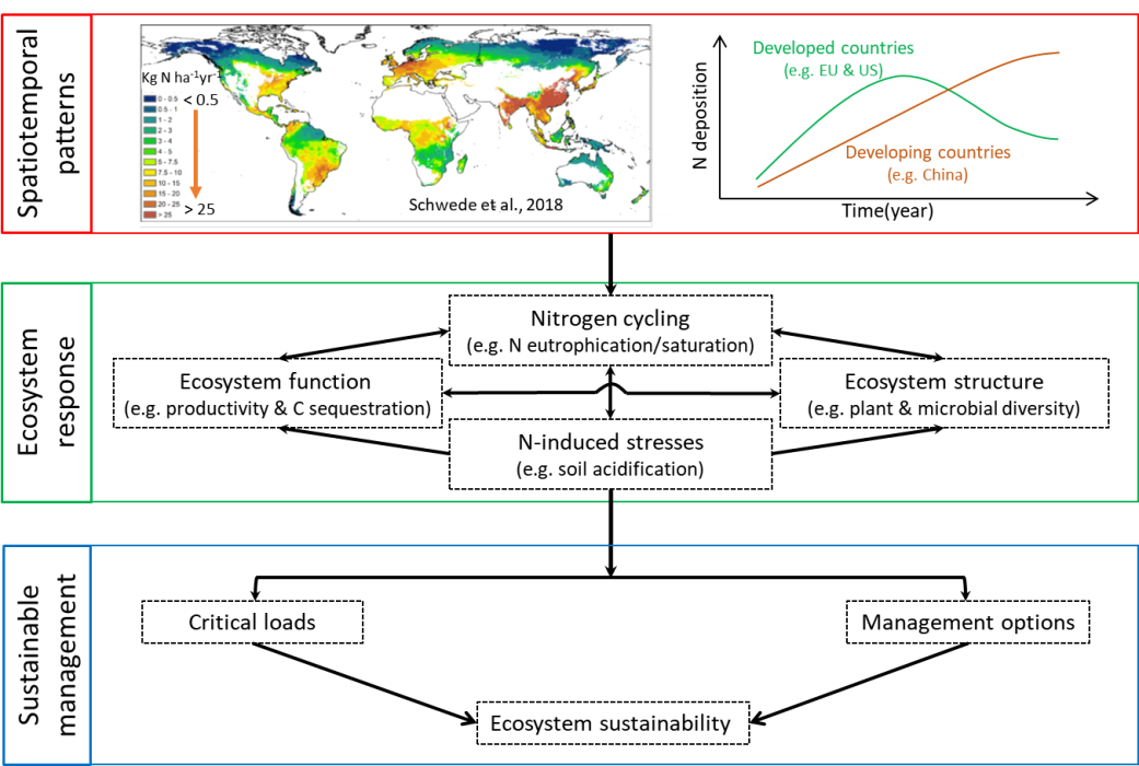 图1. 氮沉降时空变化、森林生态响应与可持续管理(专刊内容框架)。