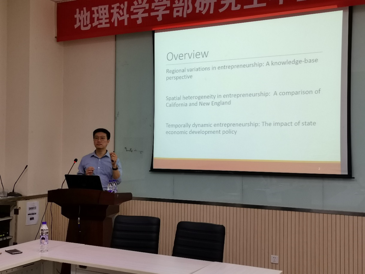 2019年6月14日上午,地理学前沿讲座第10期在生地楼148会议室成功举行。受地理学院潘峰华老师邀请,美国爱荷华大学城市与区域规划学院和公共政策中心副教授钱海峰作了题为“创业经济地理:一些来自美国的启示”的学术报告。潘峰华主持了讲座,张华、戴特奇等20等多名来自直播自慰 、中科院科技政策与管理科学研究所等单位的师生参与了本次讲座。