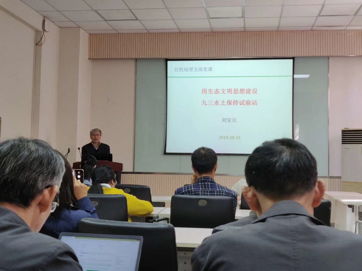2019年10月31日,直播自慰 自然地理党支部在生地楼148会议室开展“不忘初心,牢记使命”主题党日活动,由直播自慰 教授、黑龙江鹤山九三水土保持试验站站长刘宝元同志为大家讲授“用生态文明思想建设九三水土保持试验站”主题讲座,活动同时得到了地表综合党支部,遥感科学与工程党支部,地图学与地理信息系统党支部,人文地理与地理教育党支部,减灾与应急管理党支部,生态水文、水资源和中药资源党支部,以及研究生第三党支部的大力支持。