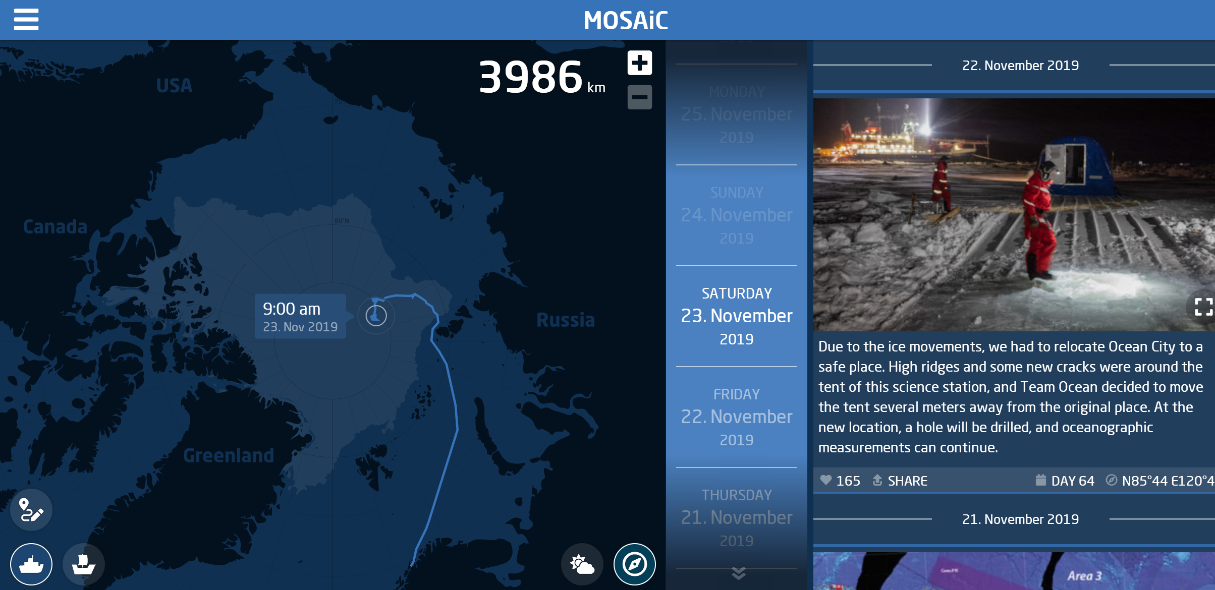 图2:“极星号“航行轨迹与当前所在位置。(当地时间2019年11月23日。原图来自//follow.mosaic-expedition.org/)