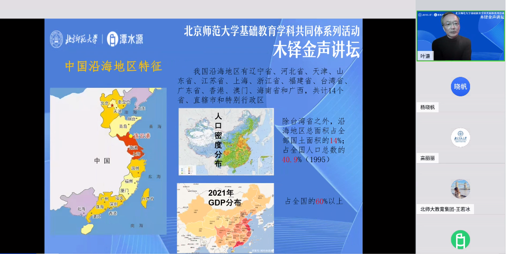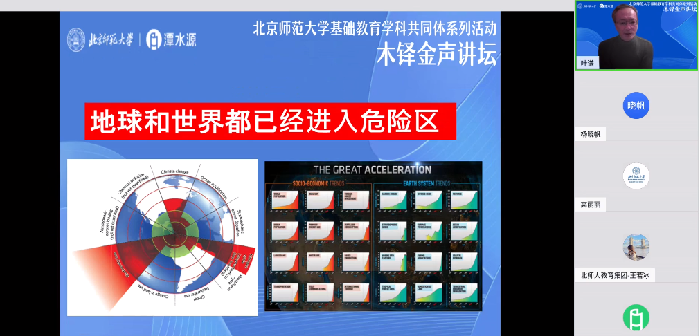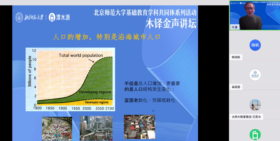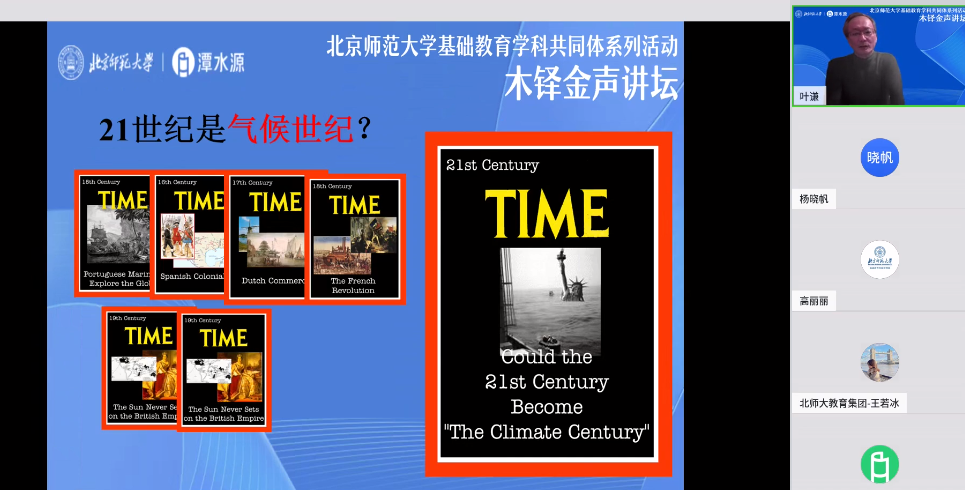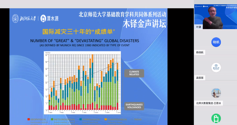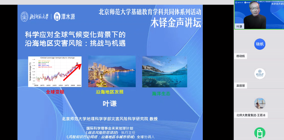 2023年9月12日上午,北师大基础教育地理学科共同体中学地理云端“木铎金声讲坛”成功举办。本次讲座的特邀主讲人是国际科学理事会未来地球计划执行主任、直播自慰 教授叶谦,讲座题为“科学应对全球气候变化背景下的沿海地区灾害风险:挑战与机遇”。讲座由北师大地理学科共同体学术委员会委员组织,北师大直播自慰 部长助理杨晓帆教授主持,共有200余位北师大附校的教师在线参与,共同探讨了沿海地区灾害风险的最新研究进展,为未来的应对措施提供了宝贵的见解。讲座的成功举办为深入了解和应对全球气候变化的重大挑战,尤其是涉及沿海地区的风险和机遇,提供了重要学习平台。