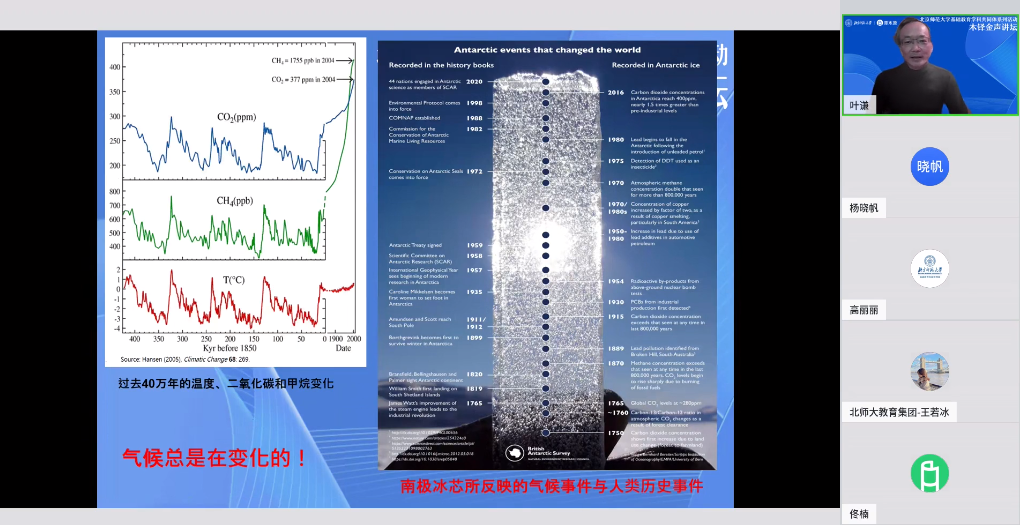 气候变化既是一门古老的学科,更是一门年轻的科学。在讲座的第二部分,叶谦教授介绍了全球气候变化科学发展简史,解答了三个关键科学问题,即:“什么是天气?”“什么是气候?”“什么是全球气候变化”,尤其强调,气候是人为的、主观定义的,而天气是客观的、可以直接感知的。叶谦教授对过去40万年、过去2万年和过去200年的温度变化规律进行了深入剖析,说明全球气候是在不断变化的,并且会发生突变。而大陆漂移(千万年尺度)、地球运行轨道(2万年尺度)、太阳活动(十年尺度)、行星碰撞等外部因素以及温室气体等内在因素都可能对气候系统造成影响。因此,联合国气候变化框架公约组织对全球气候变化做出了全新定义,即:人类活动造成的变化。